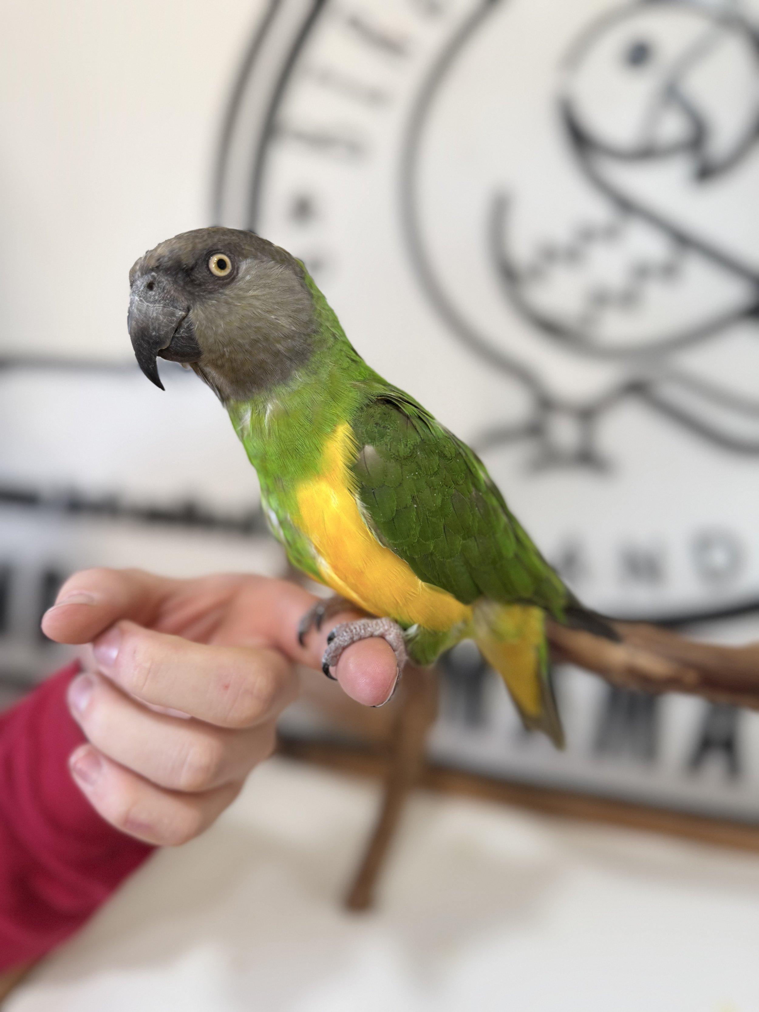 Meet Caboose, a handsome Senegal of unknown age with a big personality. Caboose absolutely adores people, especially men, and would happily spend all day riding around on a shoulder if given the chance. He’s clicker and touch trained, and he already knows a fun list of tricks like wave, about face, spin, and big bird. Caboose also enjoys vocalizing and shredding toys, with pine nuts being one of his favorite treats.