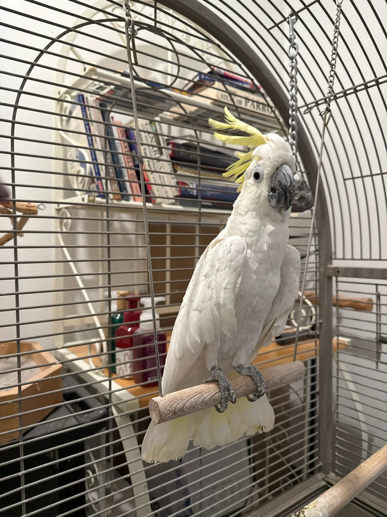 He enjoys toys and does not appear to have any strong fears or dislikes. Pal does not show a preference for men or women and does not pluck or self mutilate. He would do best in a home with someone who understands cockatoos and is comfortable caring for a bird who prefers minimal handling.