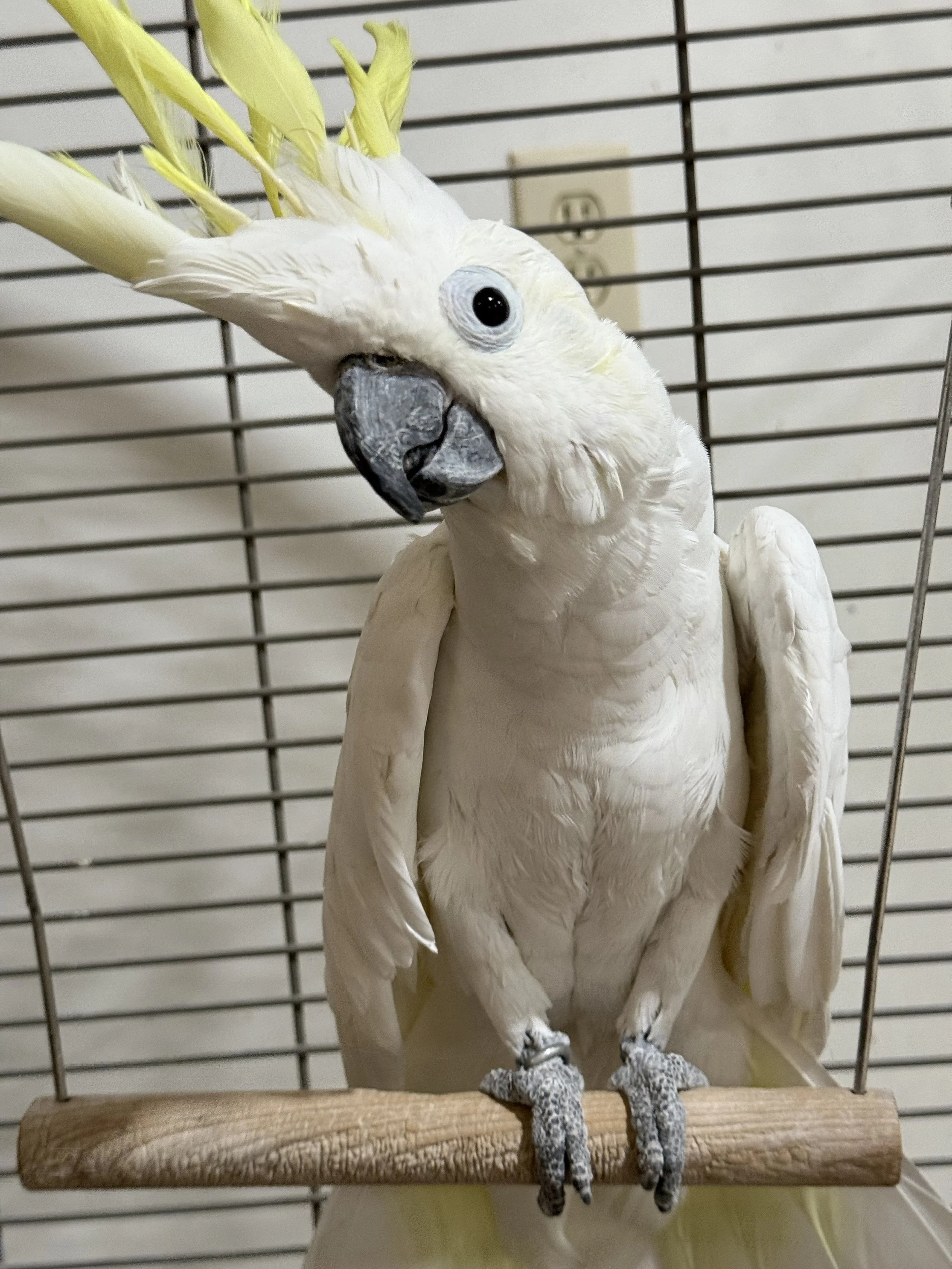 Pal is a male Medium Sulphur Crested Cockatoo who is approximately 37 years old. He is white with a bright yellow crest and has a plain metal import band that is not tight. Pal is a wild caught, imported bird from likely around 1989. He has a serious scissor beak (see images below), that will need to be maintained with regular veterinary care, at a minimum of every 6 months. (You can bring him to clinic here twice a year if you’re close enough to make the drive.)