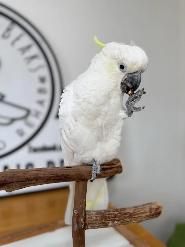 Like most cockatoos, she is loud, expressive, intelligent, and emotionally complex. She will thrive with structure, boundaries, and an experienced home that understands cockatoo body language and respects cage space. She is not stick trained.